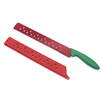 Paslanmaz çelik tırtıklı kenarlı kırmızı kaplamalı karpuz dilimleme bıçağı, karpuz kavunları için özel olarak tasarlanmış plastik saplı